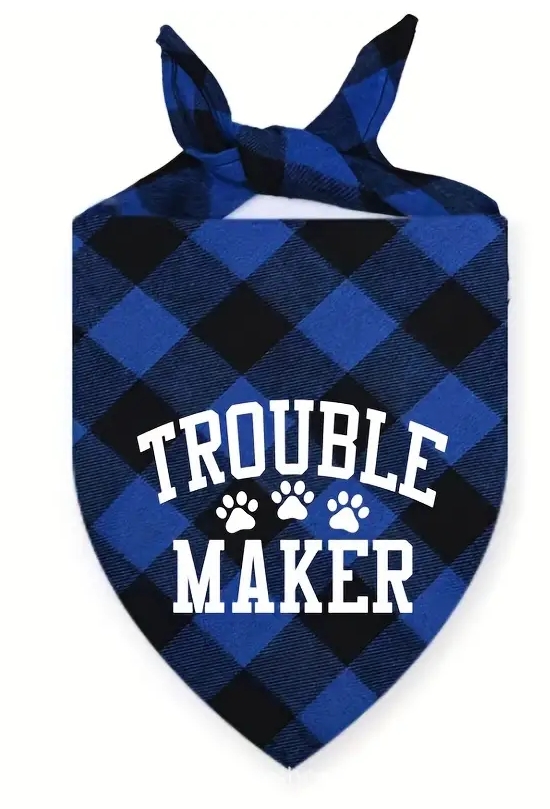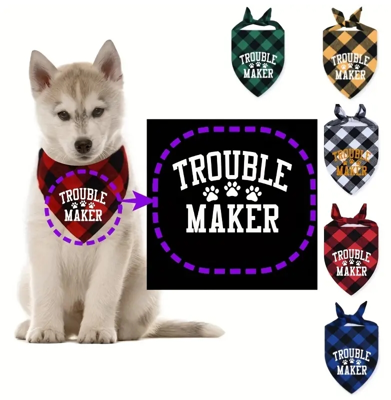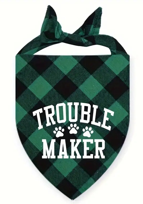 Colors: Green, Navy Blue, Yellow, Black or Red classic plaid pattern with Troublemaker print