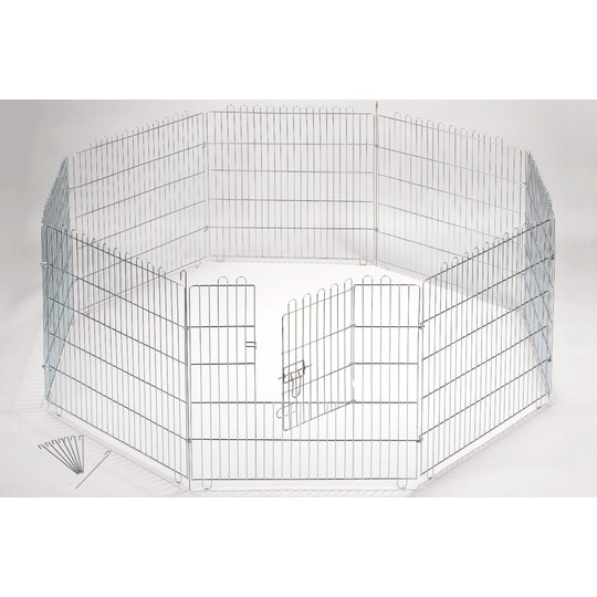 Sterk en stevig buitenverblijf van metaal, 8 elementen van elk 80 x 80cm. vormen een maximaal omheind oppervlak van 160 x 160cm. Hoogte 78cm.