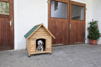 Dit hondenhok heeft een watervast Bitumen dak en doorzichtige lamellen in de opening die uw hond beschermen tegen wind, regen, sneeuw en tocht.
