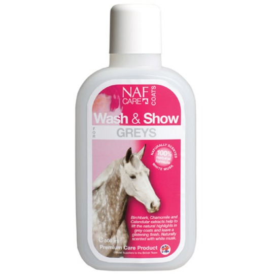 NAF Wash & Show Grey Horses 500ml. Accentueert de natuurlijke highlights in een lichte vacht.