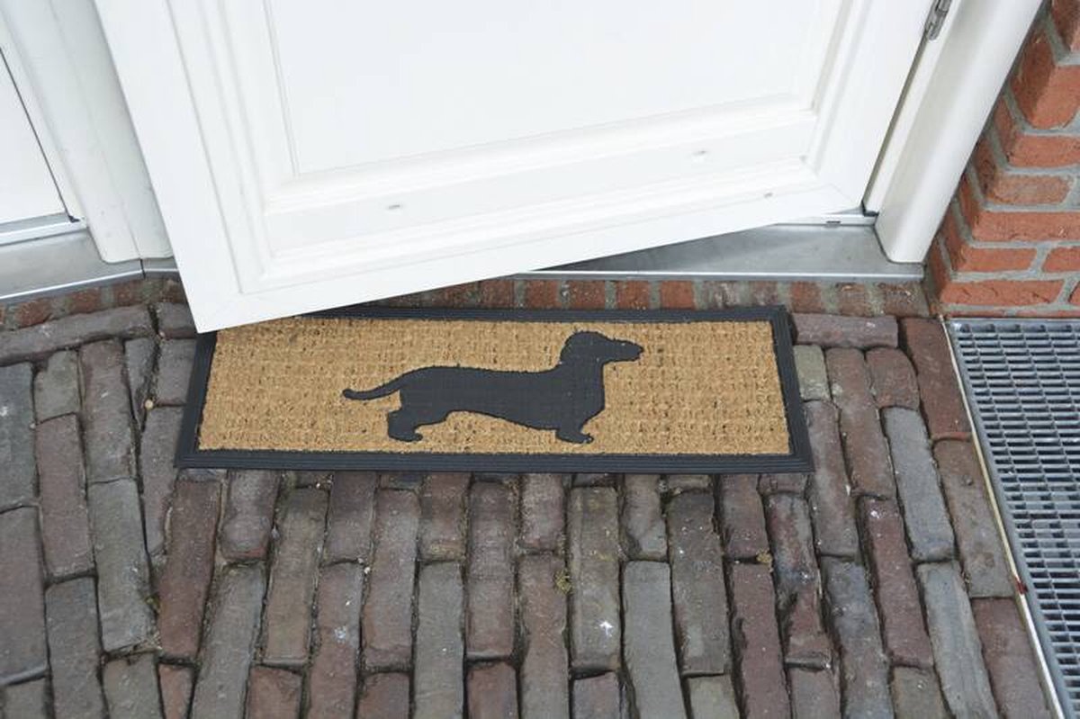 De Deurmat Teckel Rubber / Kokosvezel van 72 x 25 cm is een klassieke deurmat van kokosvezel in een zwart frame van rubber, met de afbeelding van een Teckel.