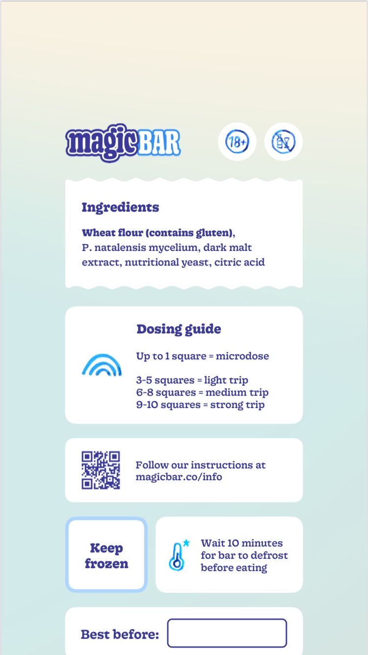 De Magic Bar is een compacte reep van 35 gram psychedelisch mycelium, gemaakt van Psilocybe natalensis. Deze soort is verwant aan de bekende psilocybinehoudende paddenstoelen, maar onderscheidt zich door een krachtig alkaloidenprofiel en een relatief milde lichamelijke belasting. Doordat het product volledig uit mycelium bestaat en niet uit vruchtlichamen, valt de Magic Bar buiten de klassieke regelgeving rond paddo's en truffels en is hij legaal verkrijgbaar.