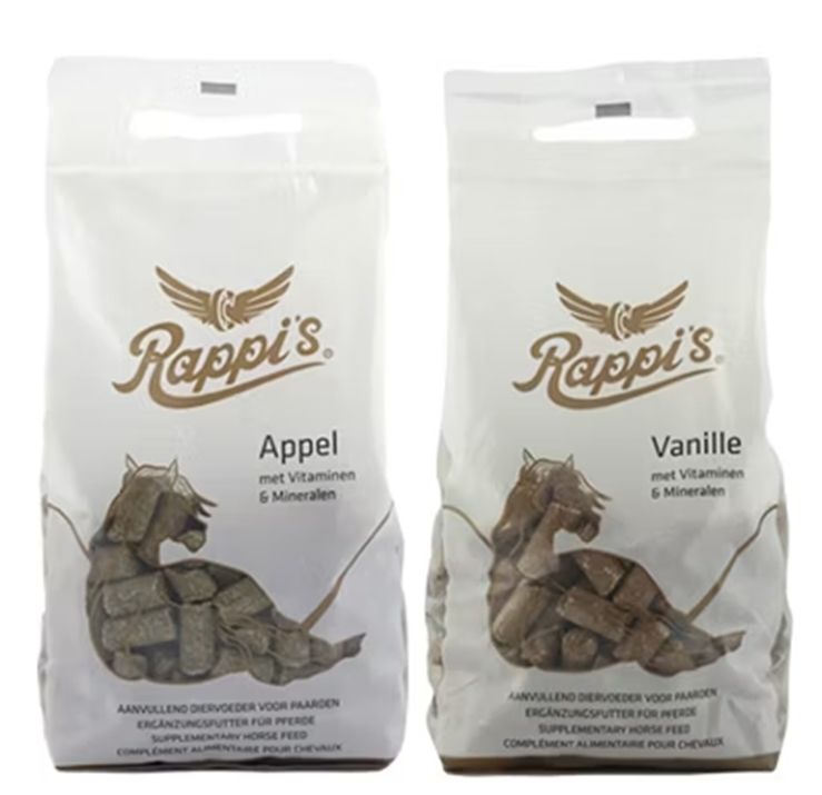 Rappi’s paardensnoepjes is een aanvullend diervoeder met gezonde granen. Met een lekkere appel-, of vanille smaak en een uitstekende acceptatie. Het helpt bij de spijsvertering.