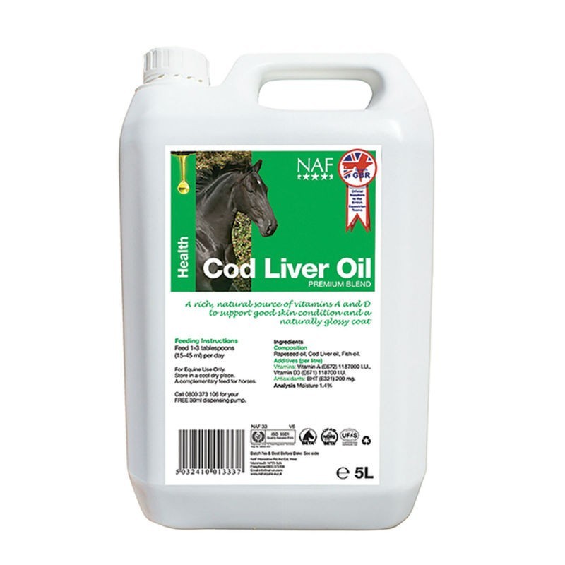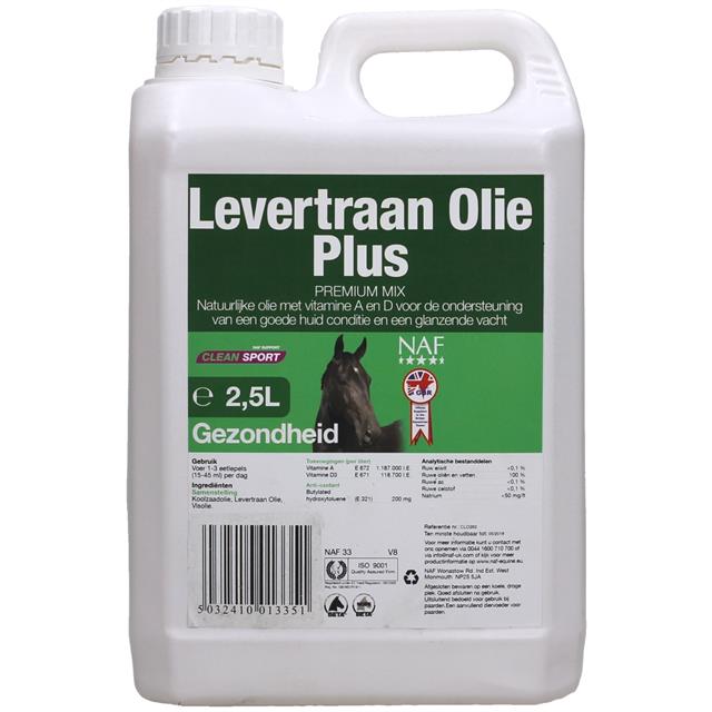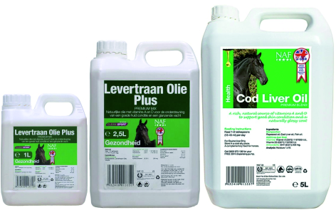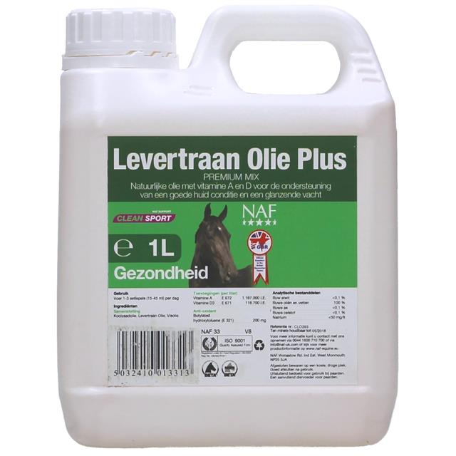 NAF Levertraan olie Plus. Zeer geschikt voor toevoeging aan het voer van jonge en oude paarden.