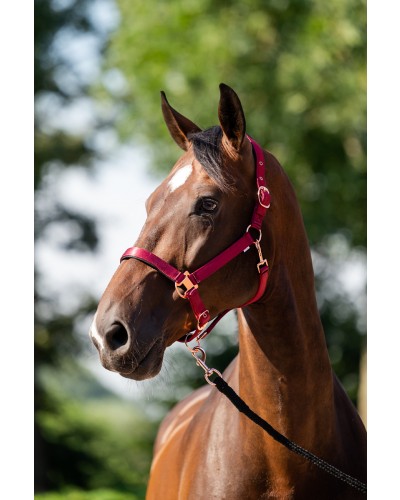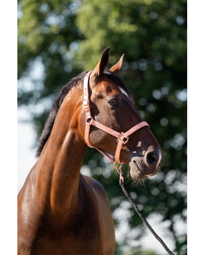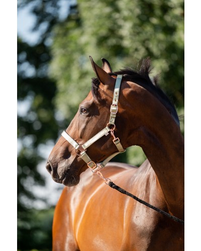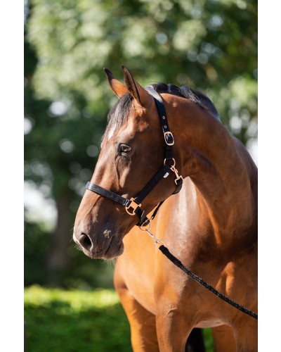 Zeer luxe halster in leder look satijn met rosé gouden fournituren (speciale uitvoering), bijgeleverd een luxe halstertouw met extra zware rosé gouden musketon.