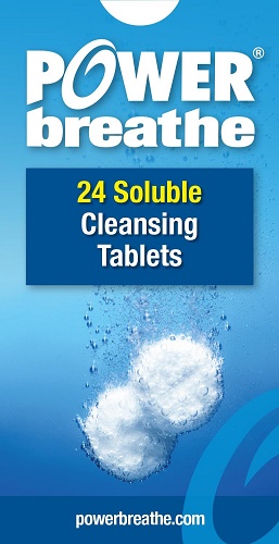 Te gebruiken bij het wekelijks grondig reinigen van uw POWERbreathe apparaat. Voeg een (1) tablet toe aan handwarm water en laat de POWERbreathe hierin 10 tot 15 minuten weken. Daarna goed afspoelen onder stromend water, water afschudden en laten drogen. POWERbreathe apparaten kunnen niet in vaatwassers of magnetrons gereinigd of gedroogd worden! Dagelijks kan volstaan worden met het goed afspoelen van het mondstuk.