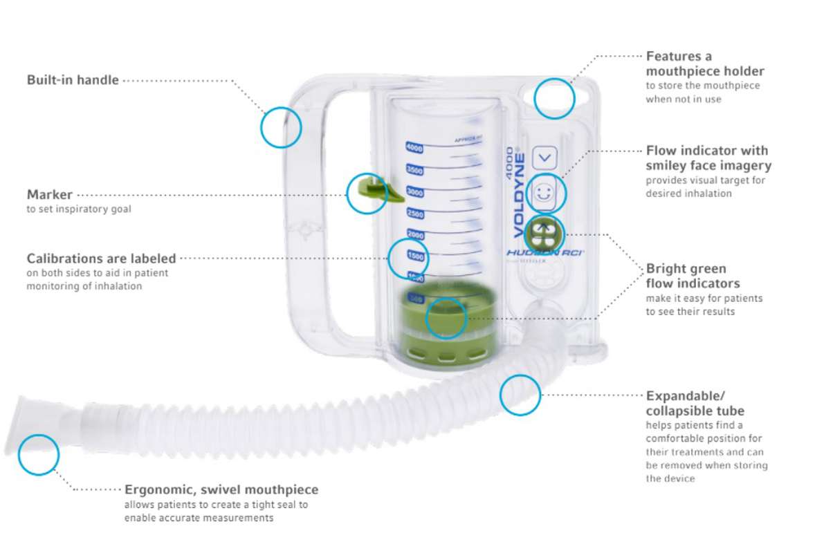 Voldyne 4000, incentive spirometer gericht op verdiepen van de ademhaling. Indicator ingeademd volume 4.000ml. Maximaliseert het gebruik van uw vitale longcapaciteit. Verbetert de inademingscapaciteit en doorluchting van de longen, vermindert benauwdheid. De groen indicator (rechts) geeft aan of uw voldoende snel inademt, met de schuif aan de linkerkant markeert u het volume van de inademing aan.