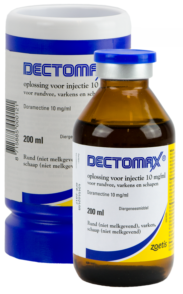 Dectomax Injectie 250ml. --- Voor de bestrijding van infecties door maagdarmwormen, longwormen, oogwormen, horzels, luizen en mijten bij niet melkgevende runderen, niet melkgevende schapen en varkens.