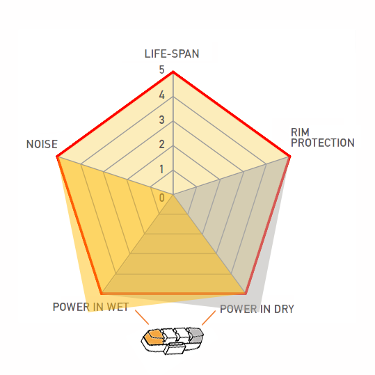 Door de triple compound samenstelling hebben de blokken extreem goede eigenschappen in zowel droog als nat weer. Zie onderstaande grafiek.